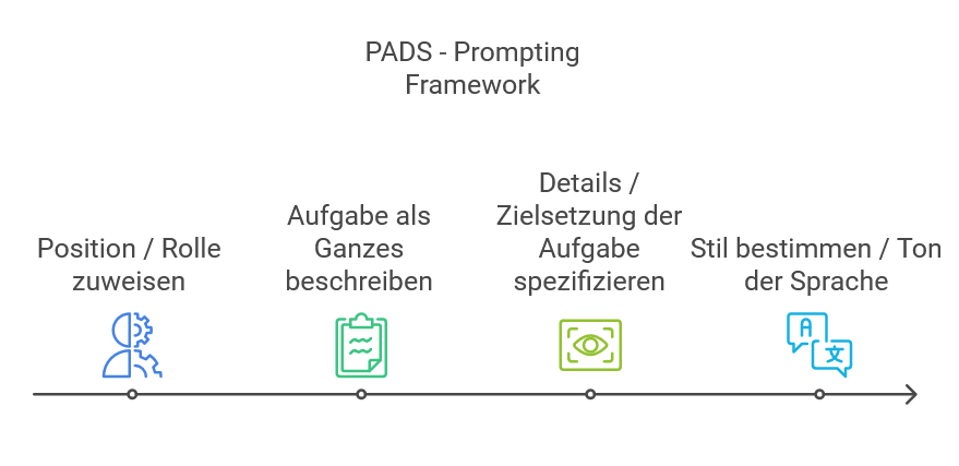 Das PADS-Prompting Framework ist eine einfache Methode, um effektive Anweisungen (Prompts) für KI-Systeme zu erstellen. Es besteht aus vier Elementen: